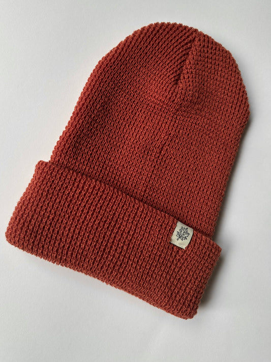 Maple Leaf Cuff on Rust Waffle Knit Beanie