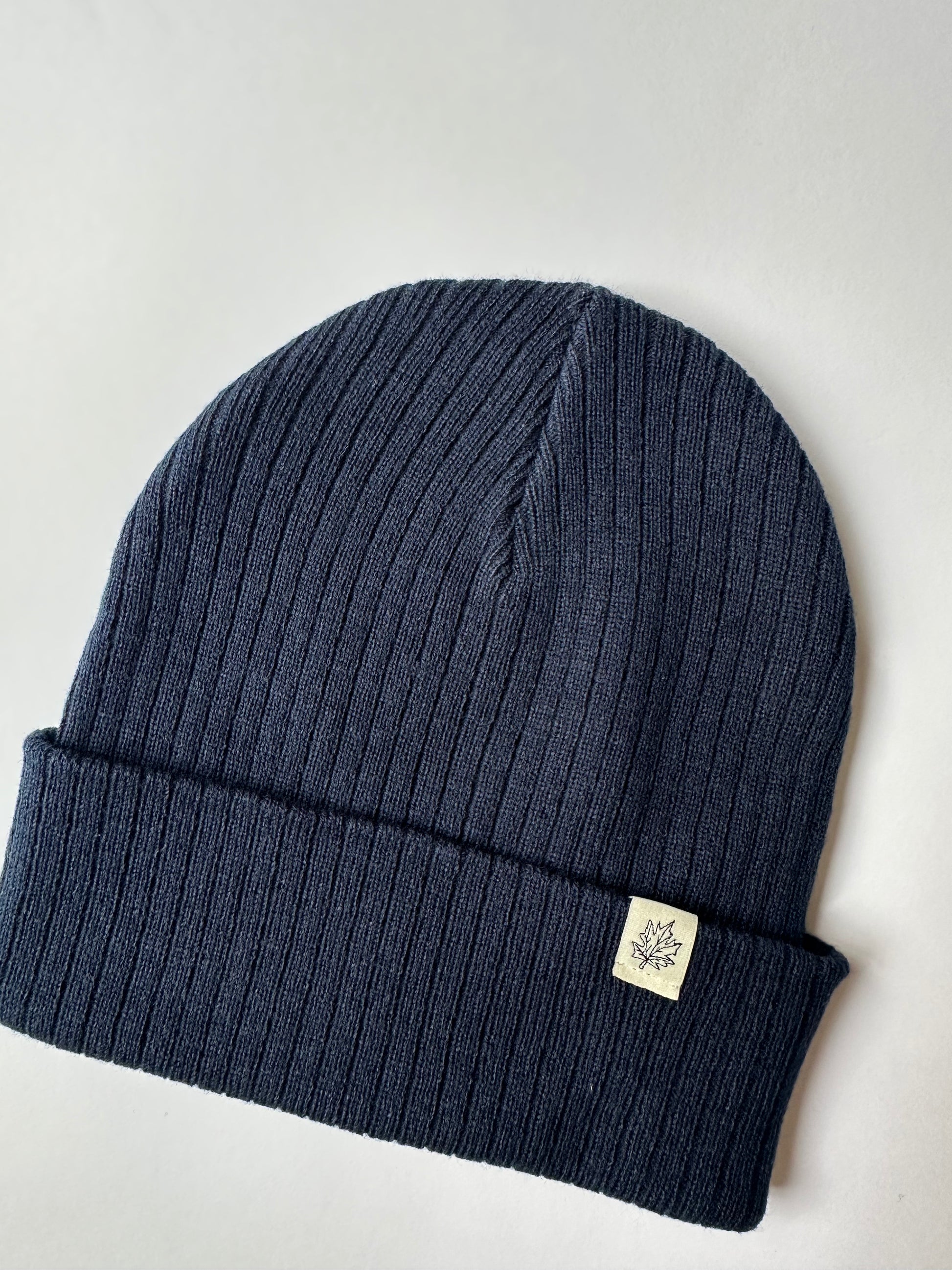 Maple Leaf Cuff on Navy Ribbed Beanie